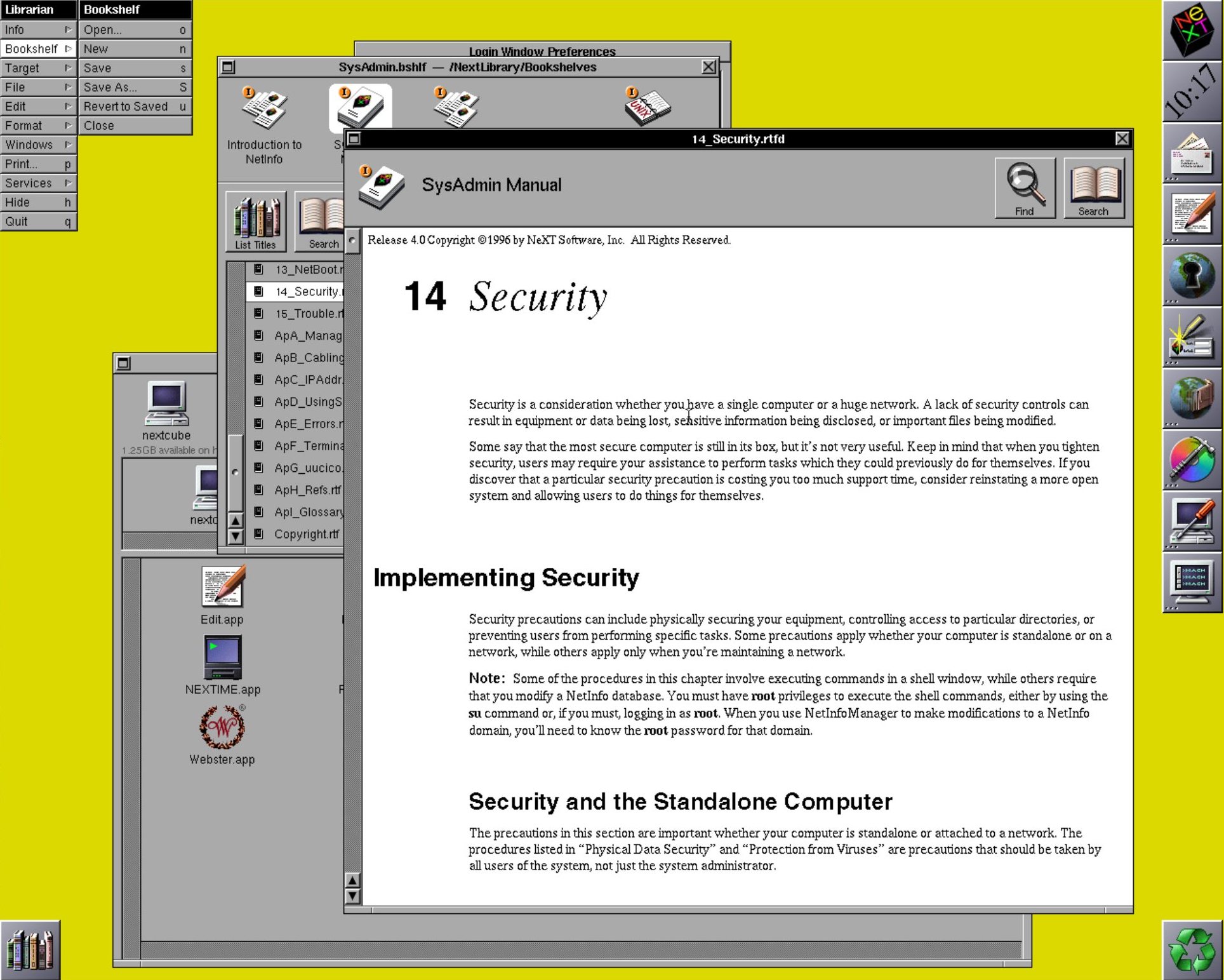 OpenStep was built for a friendlier network era, but NeXT’s own System Administration Guide (Release 4.0) includes several practical ways to tighten things up. Here are a few quick checks worth doing — or at least exploring — before you put your cube on a modern LAN.