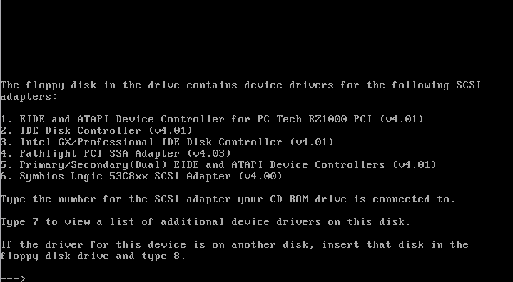 Once your VM is configured, attach the Install floppy and the User CD, then boot the system; follow the on-screen prompts until you’re asked for the driver floppy — insert it when prompted.