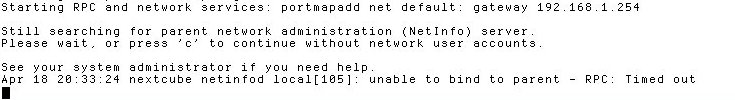 One annoying configuration issue I encountered without clear documentation was with netinfod searching for a parent on boot. As configured during install, netinfod will broadcast for a NetInfo parent regardless of whether NETMASTER=-YES- is set in /etc/hostconfig or not.
